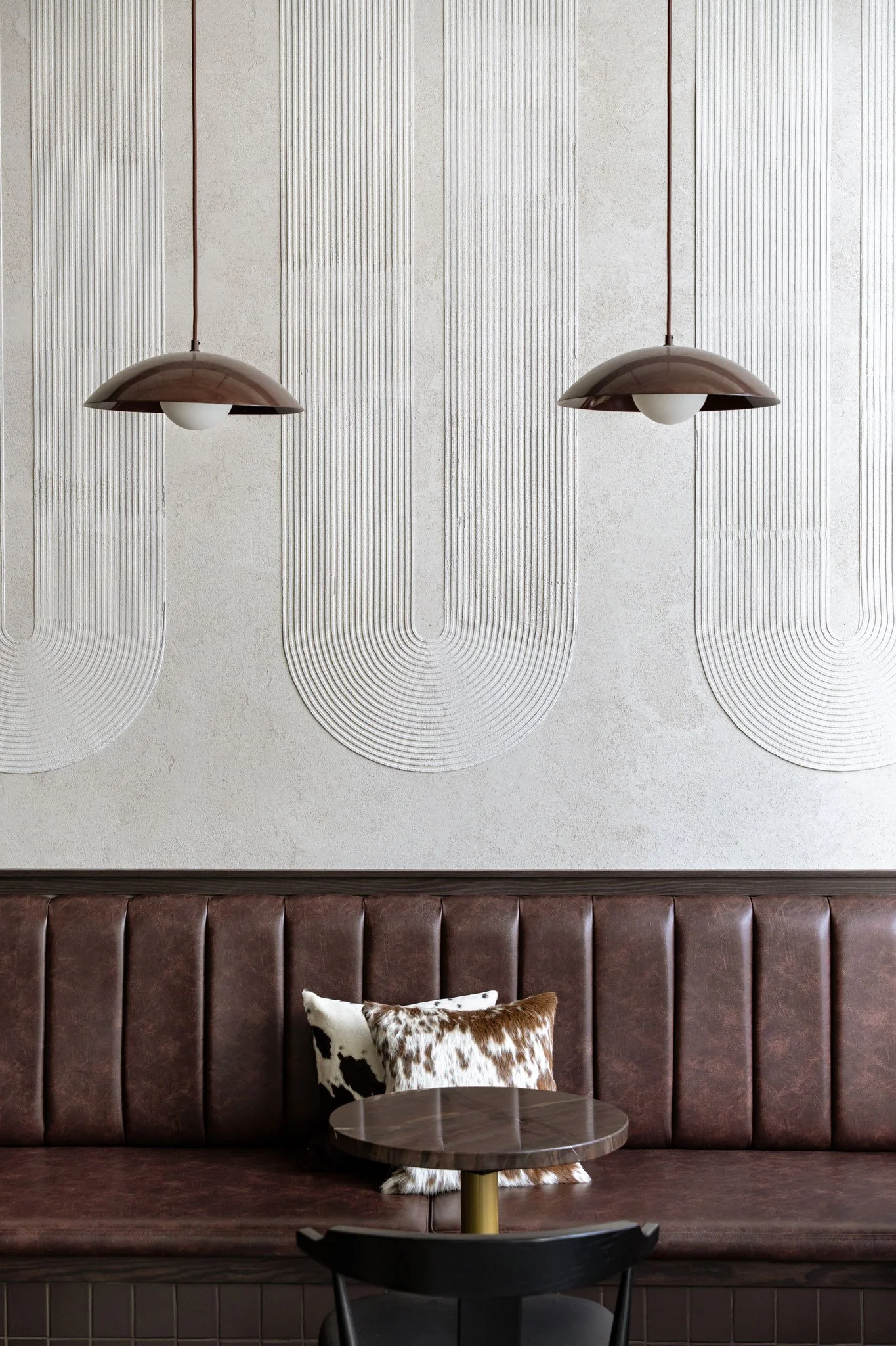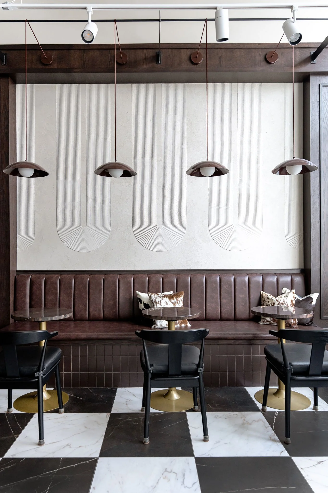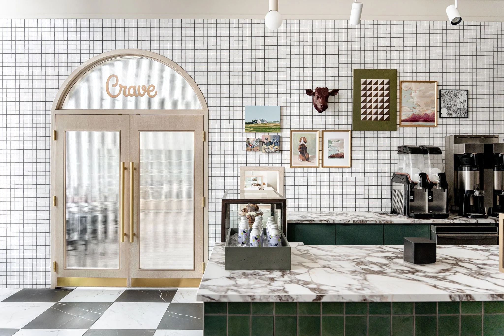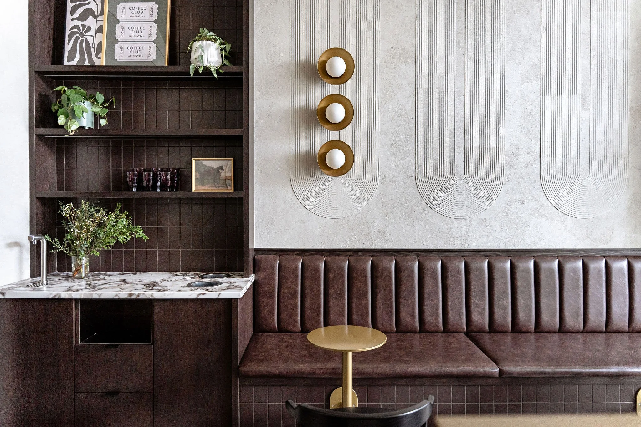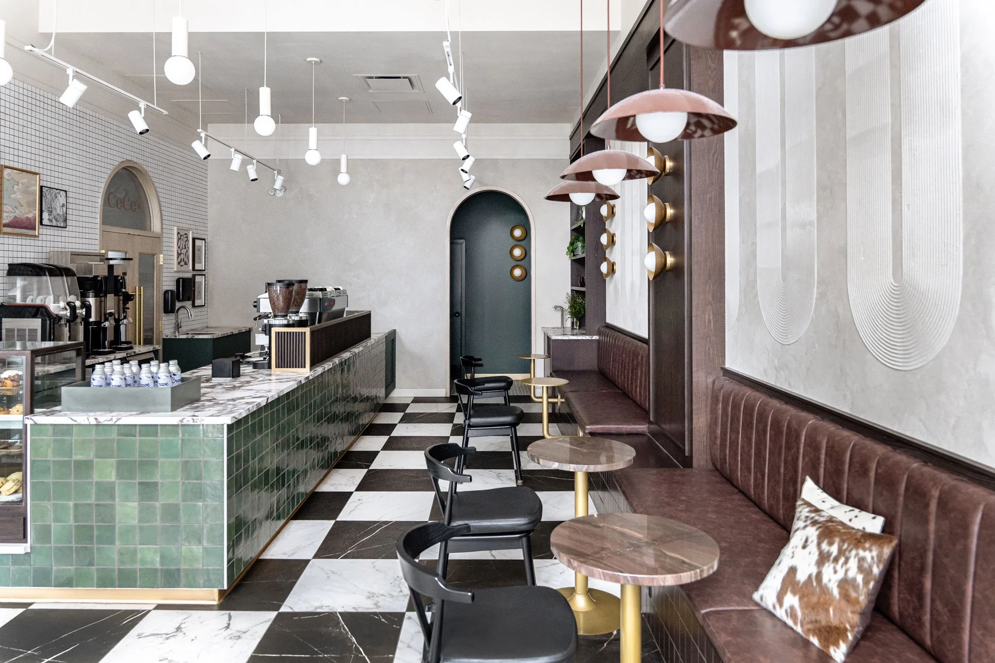 Connected to Crave in West Hillhurst, Cece's Coffee delves into a delicious palette with an efficient layout that includes plenty of seating options for the floor space the café occupies. Customers are greeted with a long service counter, directing the flow of circulation. Natural light floods into the café, illuminating the marble checkered floor. Jewel tones pair with dark wood and leather banquettes to create an experience of warmth and richness. Durability and use were carefully considered to ensure an optimal experience for customers and employees. A plaster detail finish on the walls grounds the space and layers texture onto the palette.