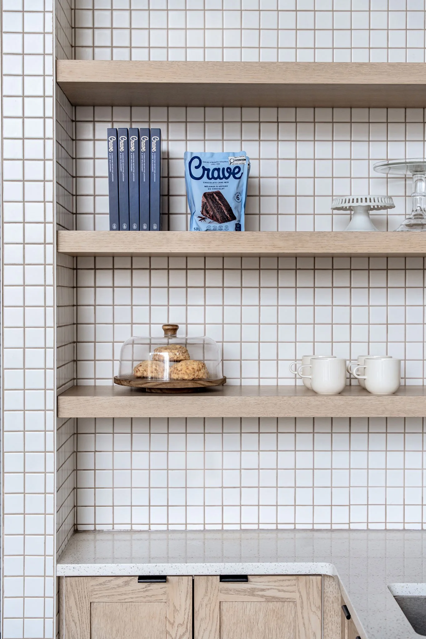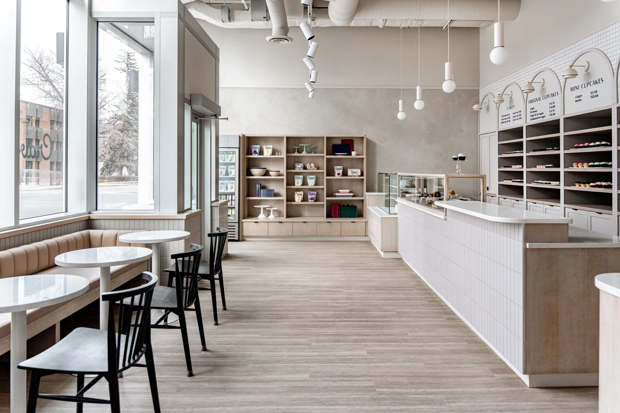 Connected to Cece's Coffee in West Hillhurst, Crave underwent a rebrand, resulting in the inclusion of more seating within the space for customers. Spatial planning included a full kitchen and back of house, service counter, retail space, and seating. Carefully considered, the bakery was meticulously planned for efficiency and ease of use. Large windows near its entrance guide natural light in and through Crave. Designed with a neutral palette, natural finishes complement the open space, creating a confident calm.