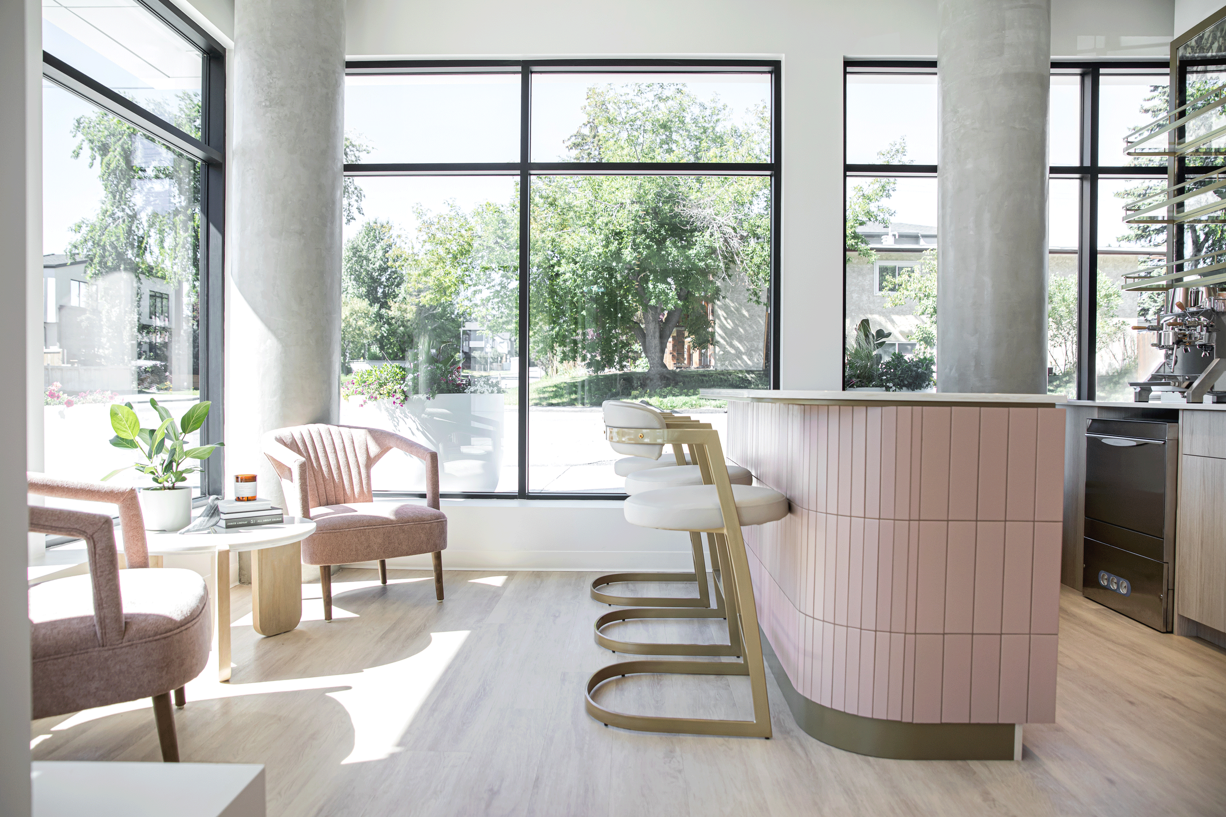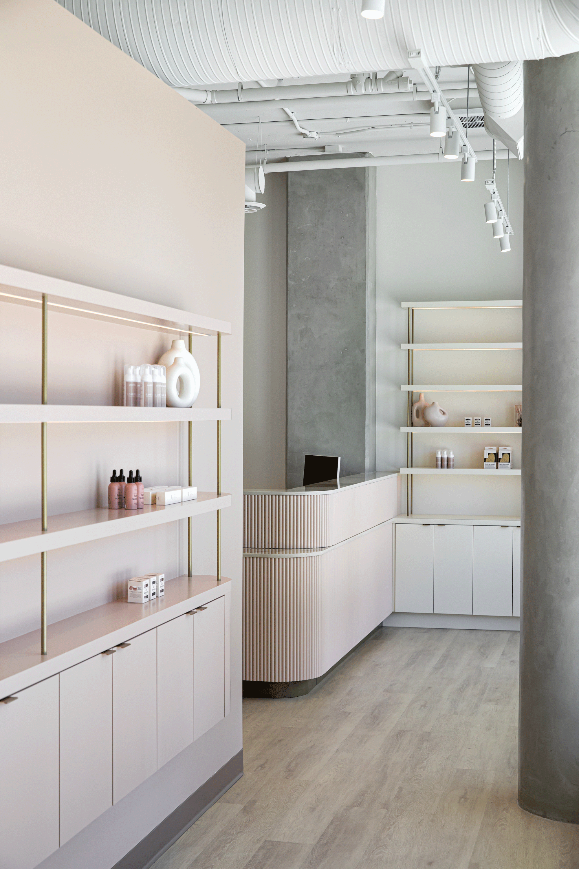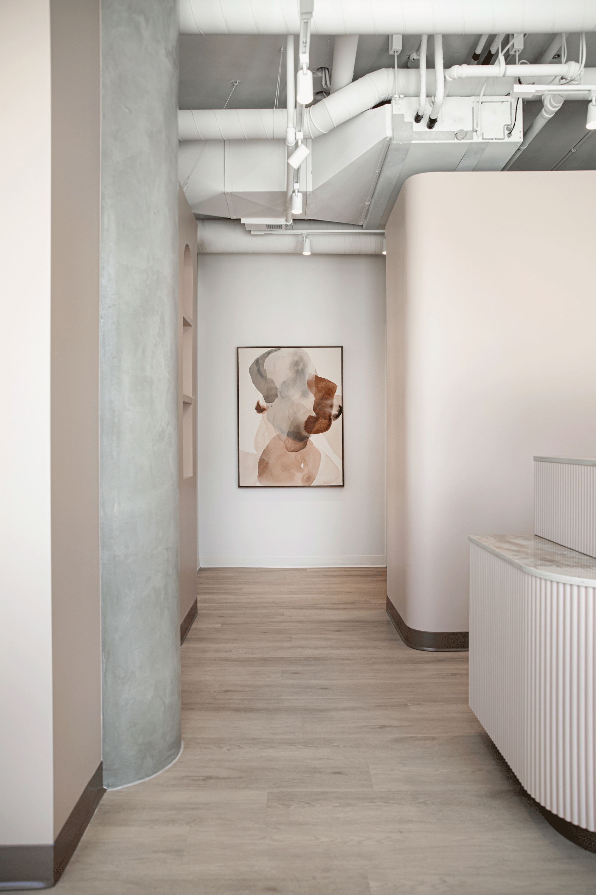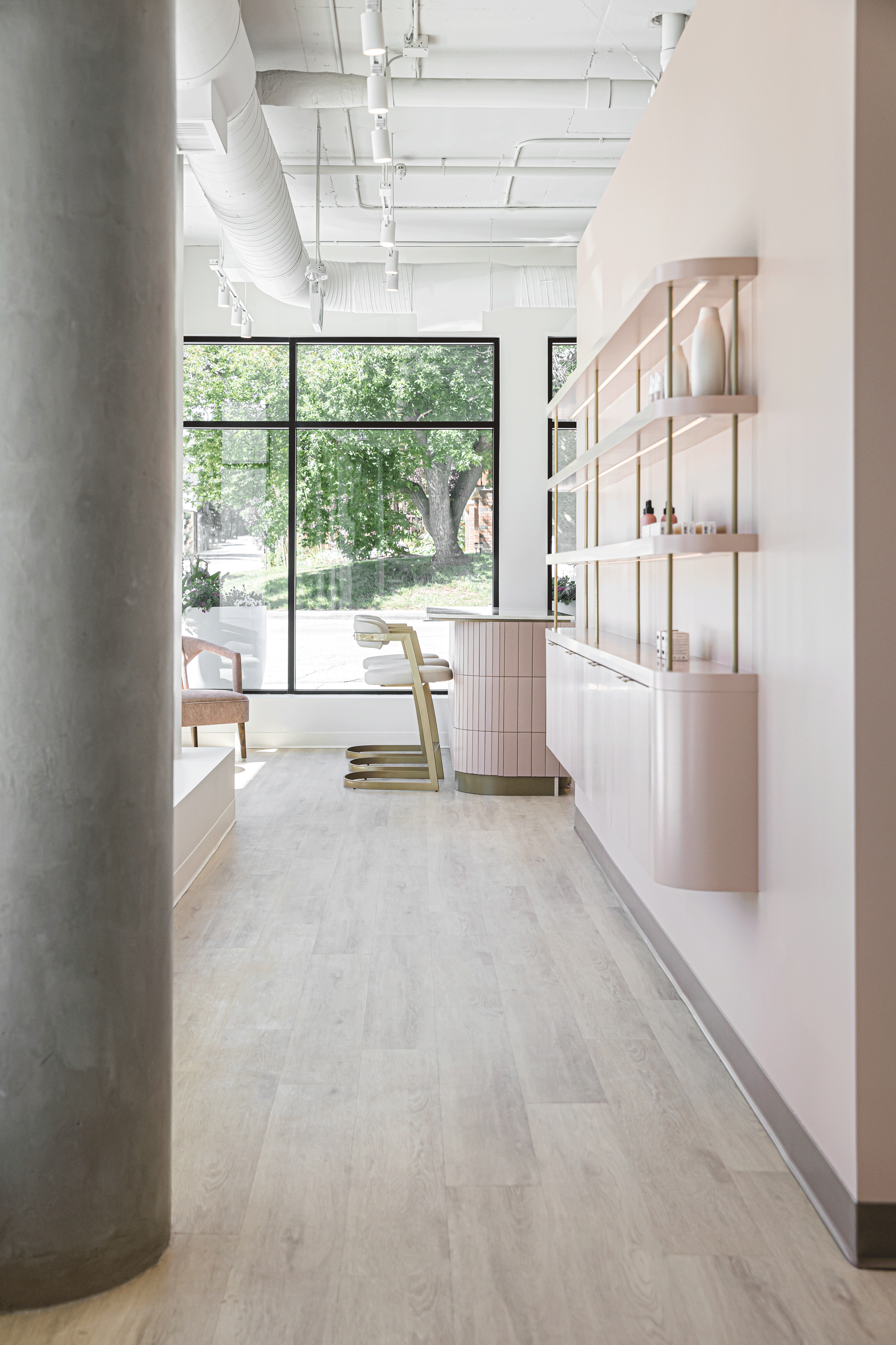 A soft, feminine palette of blush tones and warm neutrals is layered against exposed concrete and industrial elements, creating a space that feels both elevated and grounded. The result is a welcoming, modern environment that reflects LOLA’s commitment to safety, professionalism, and confidence-building beauty experiences, while celebrating the spirit of a proudly female-owned brand.