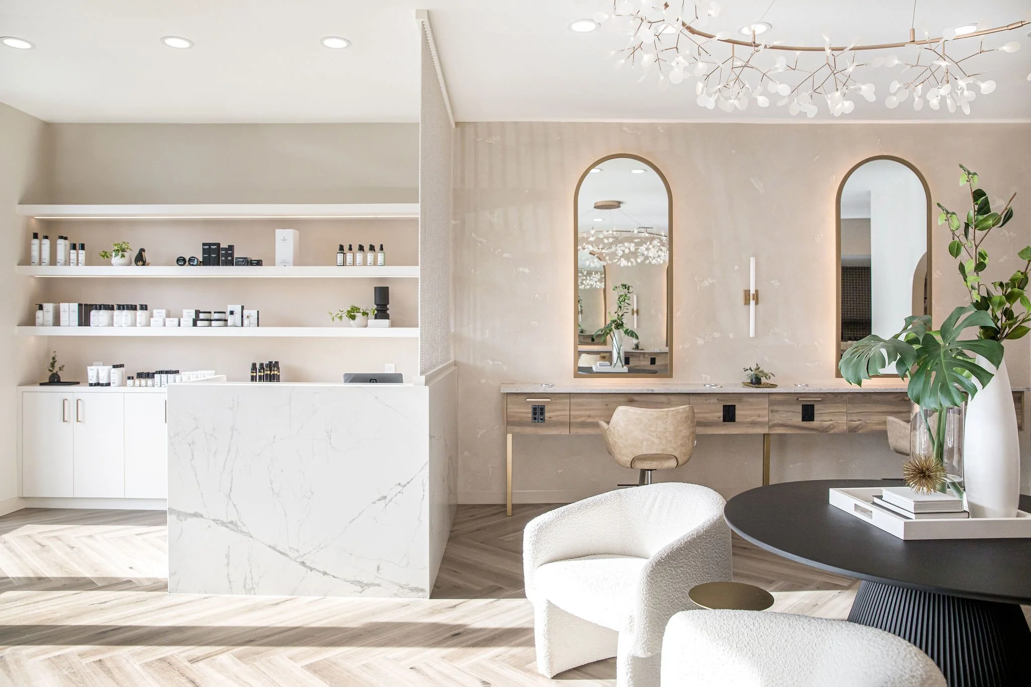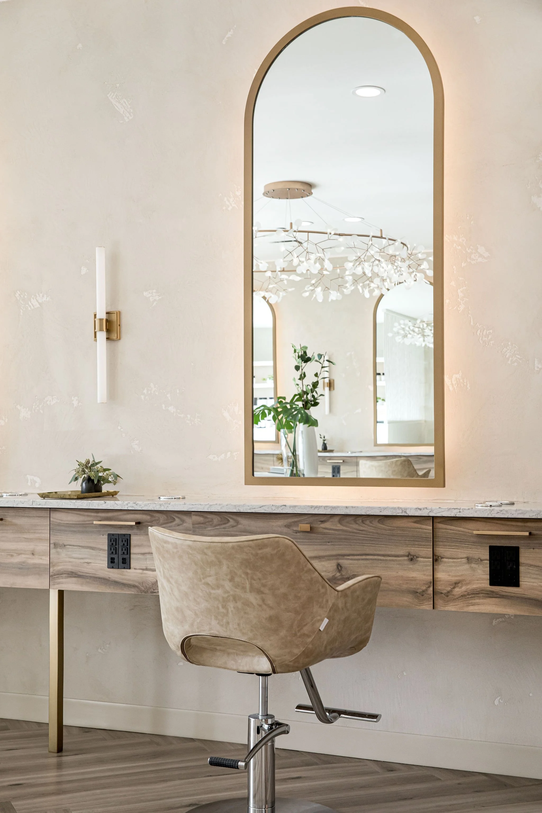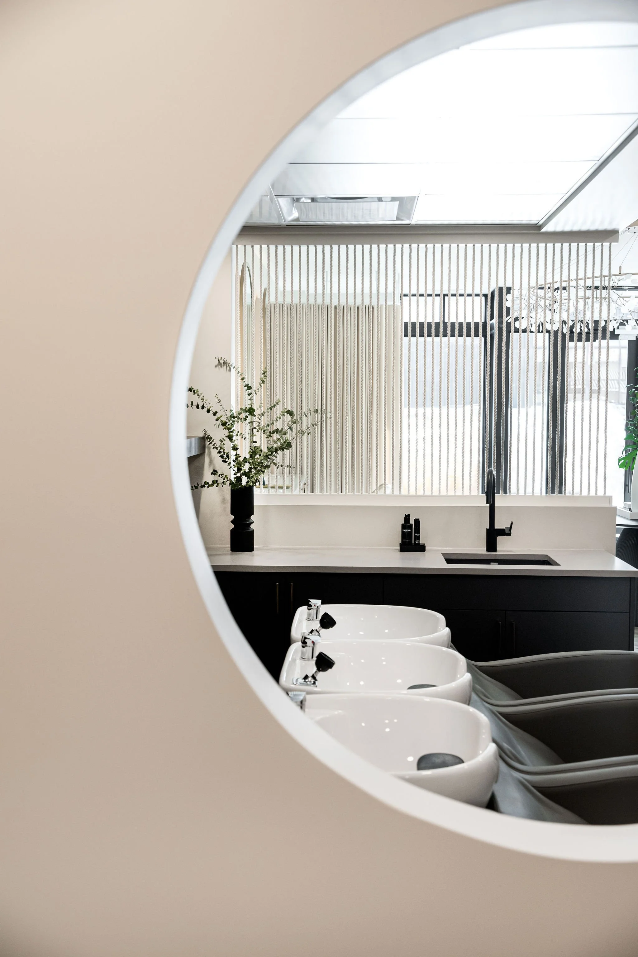 Ambient, task, and accent lighting work in harmony to enhance both precision and atmosphere, while layered drapery, boucle fabrics, and curated artwork add softness and personality. The result is a modern salon that feels like a sanctuary—celebrating the craft of hair colouring in a space designed for beauty, luxury, and connection.