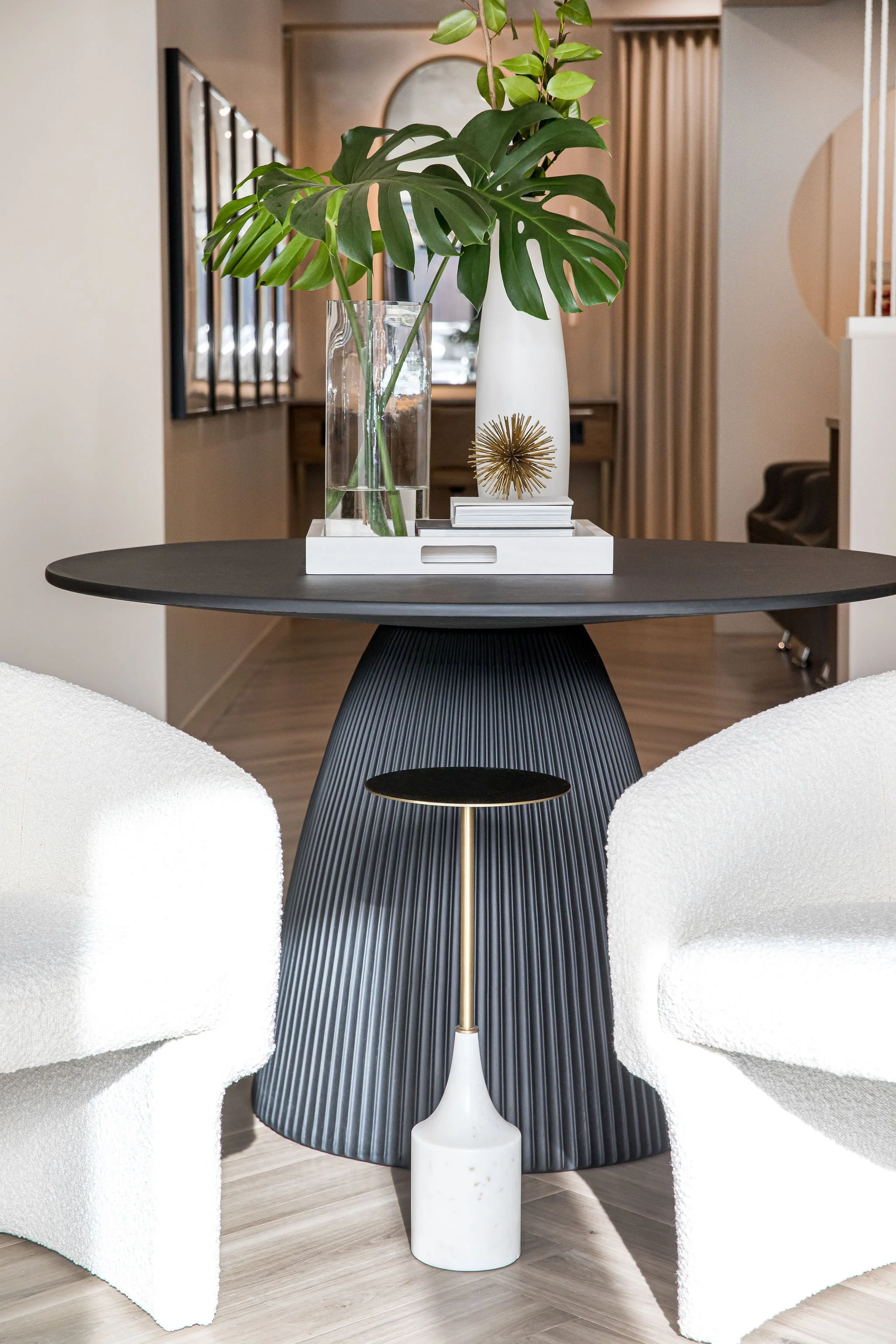 Inspired by the artistry of balayage, the concept blends minimalist elegance with functional comfort. A palette of soft neutrals—white, beige, and charcoal—pairs with marble-look surfaces, warm woods, metallic accents, and plaster-textured walls to create depth and visual interest. Rope screens, fluted details, and custom storage solutions balance aesthetics with efficiency, keeping the space refined and uncluttered.