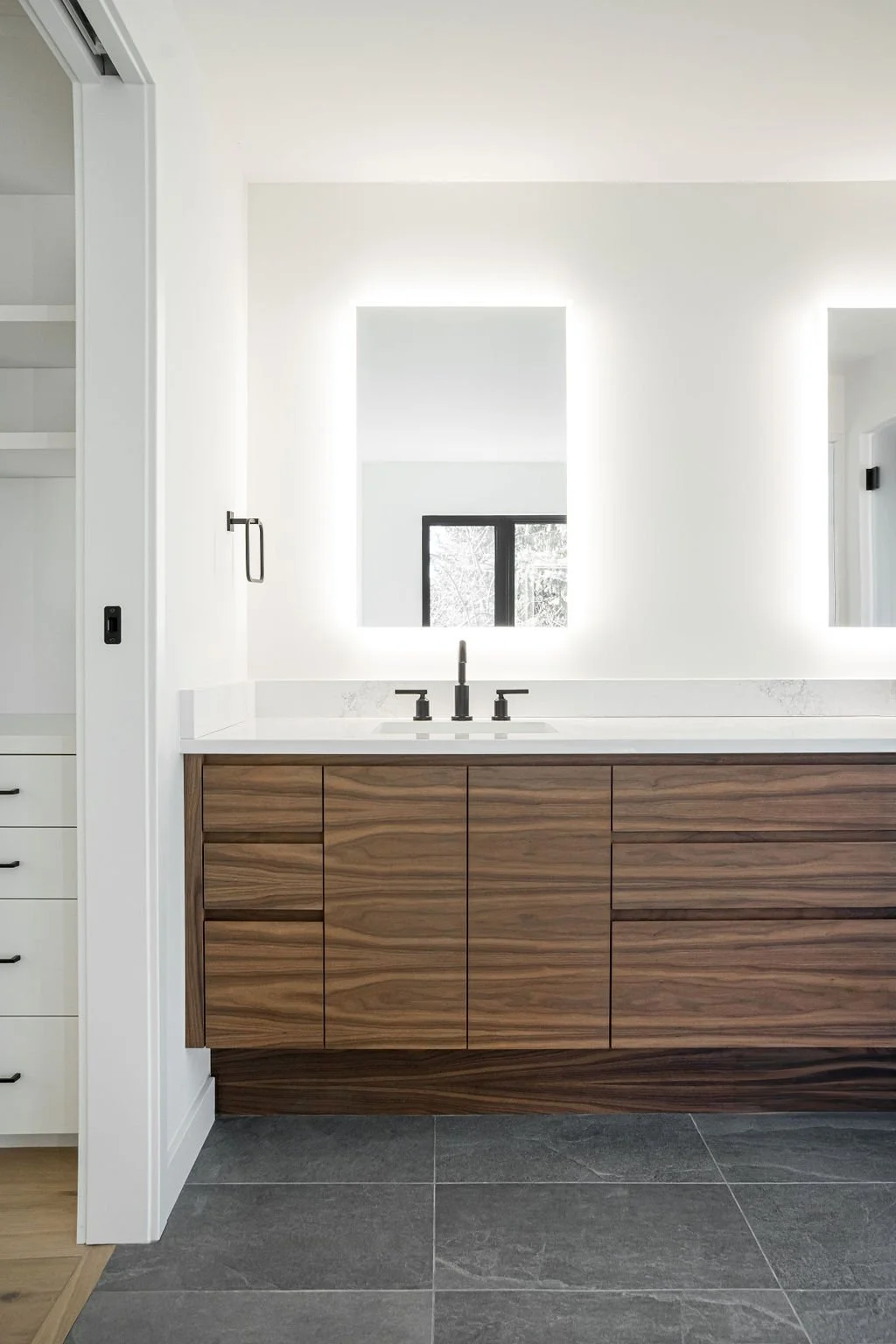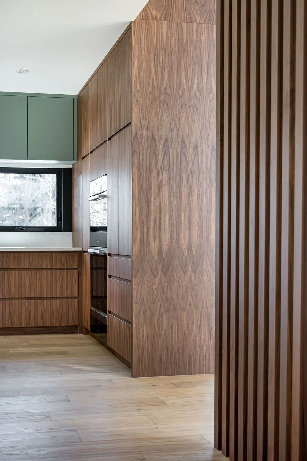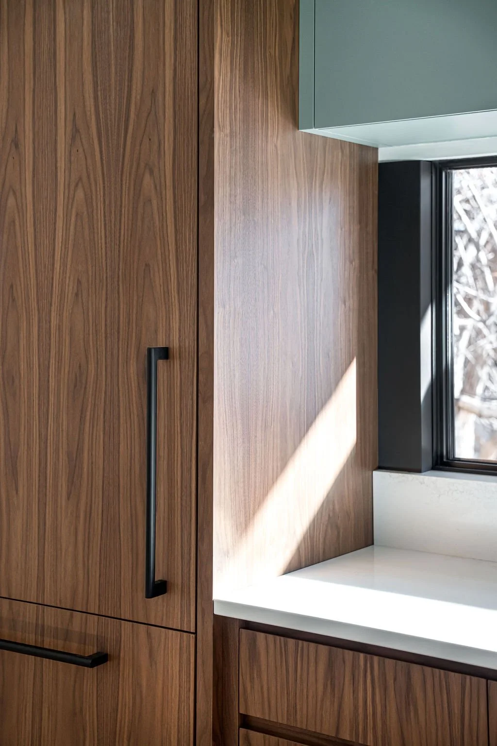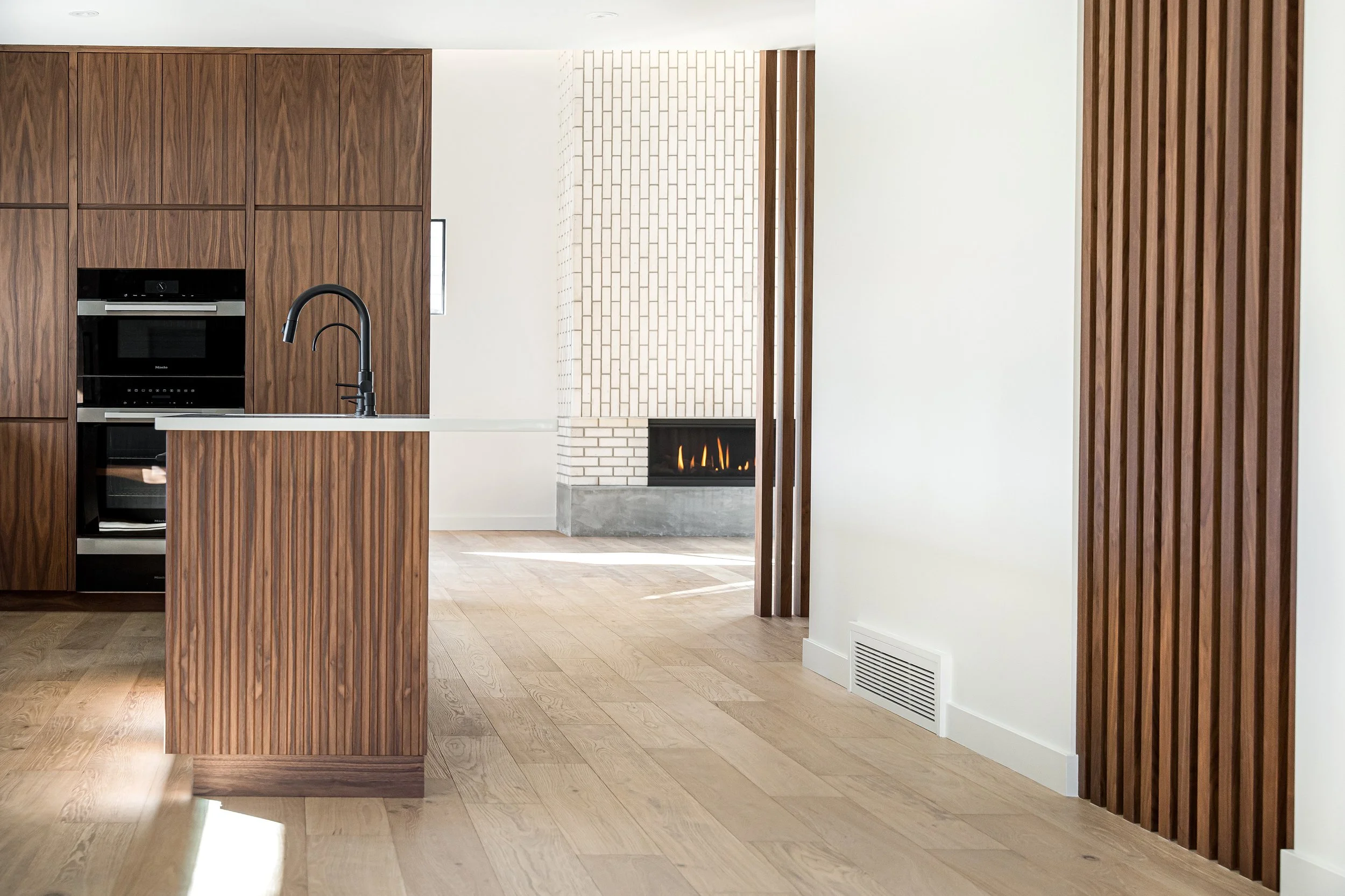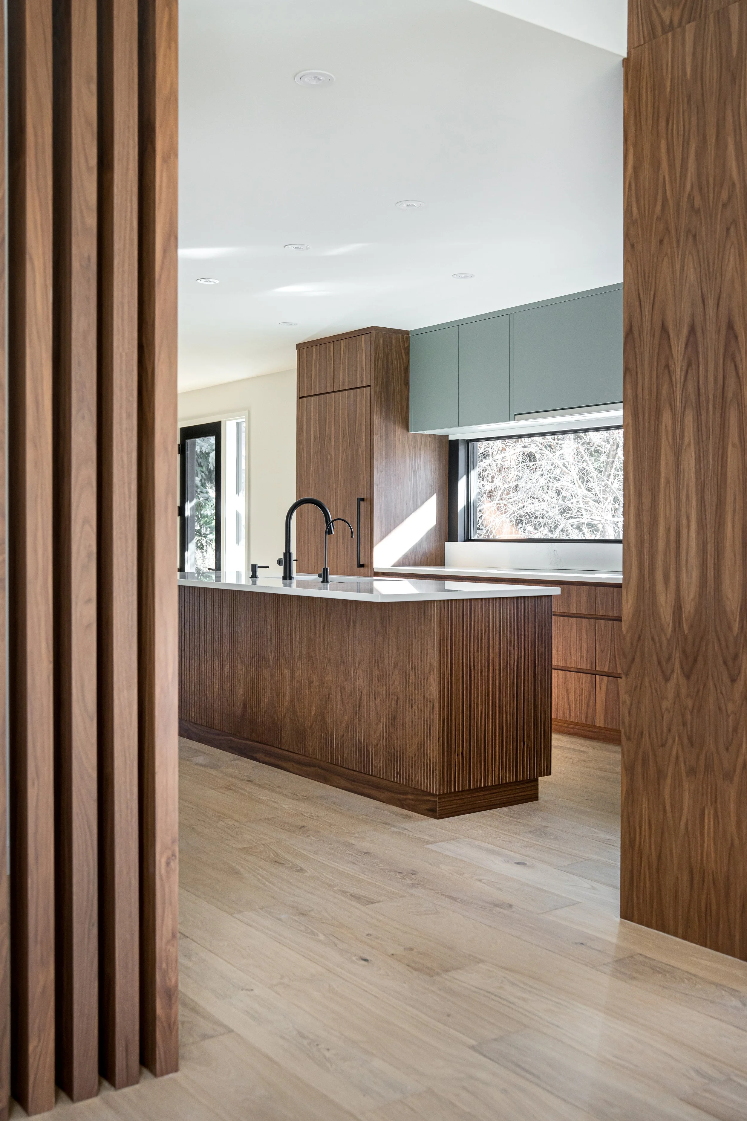 Inspired by mid-century modern principles; well-suited to the neighbourhood and the family’s aesthetic; we designed clean, modern lines warmed by natural materials that flow seamlessly from exterior to interior. Double-volume spaces and strong indoor–outdoor connections maximize light and views, while thoughtful spatial planning within the semi-open layout creates visual curiosity and glimpses into adjacent rooms. The salvaged mature landscape grounds the home in its original setting. The result is a modern residence that feels expansive, welcoming, and timeless.